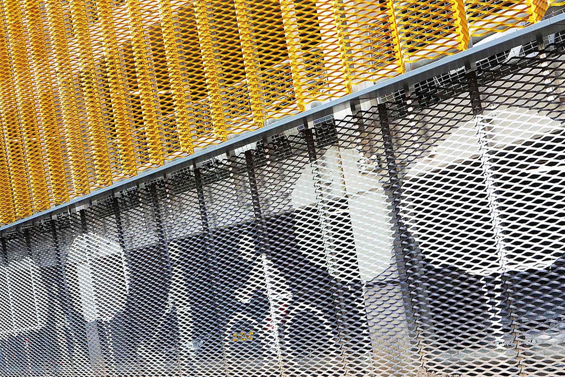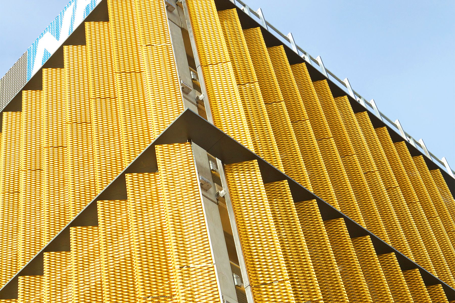 Alla base della facciata le lamiere stirate sono serigrafate con un paesaggio urbano per attirare l'attenzione al livello del piano stradale e guidare gli automobilisti verso ingresso e servizi.